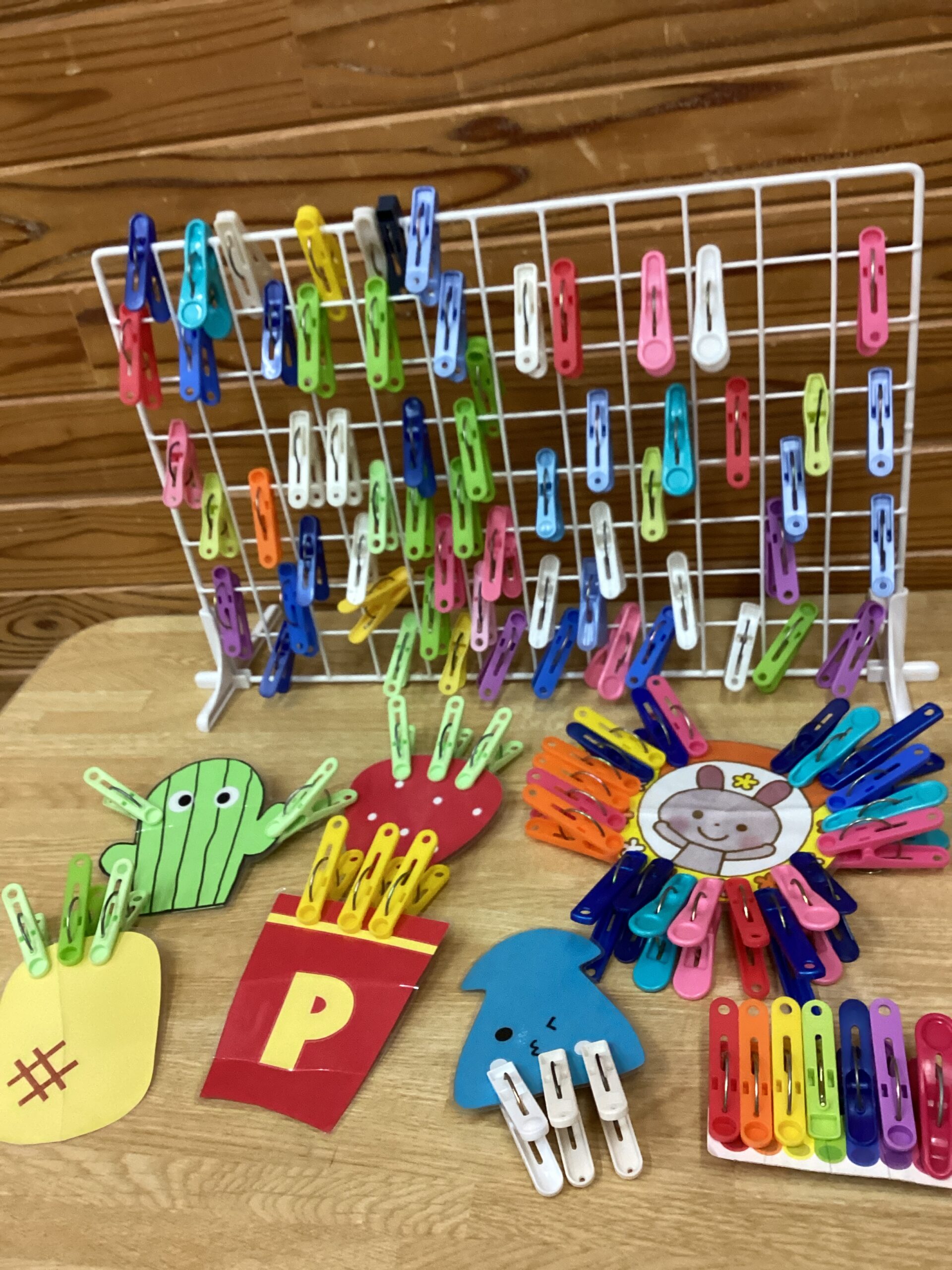 洗濯ばさみを使って、洗濯ごっこををしたりカードを使いポテトやイカの足に見立てて遊びをしたり!!