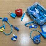 写真のような道具を使って、お客さんと店員さん、お医者さんと患者さん、それぞれの役になったり、おままごとで