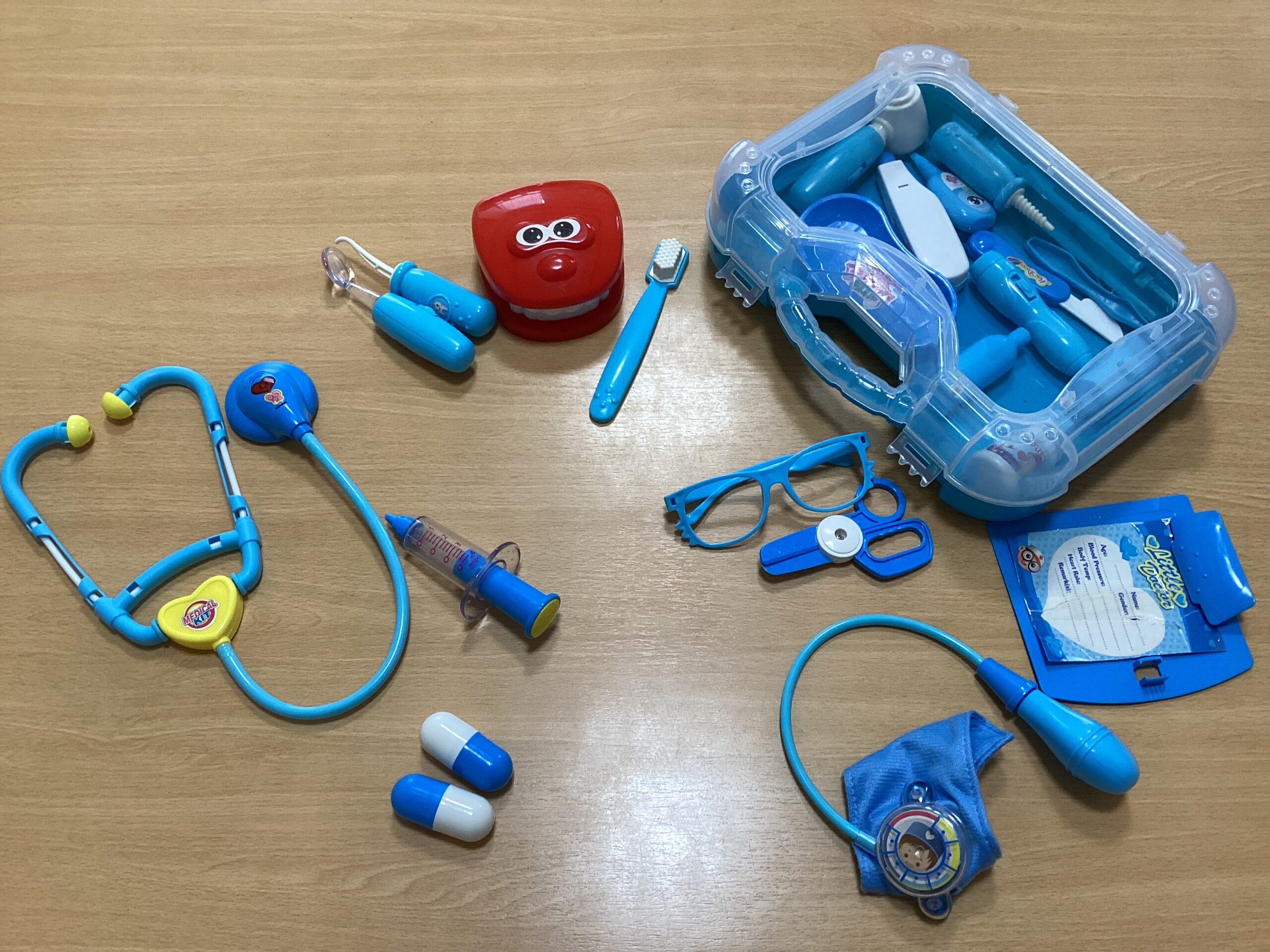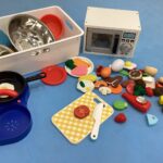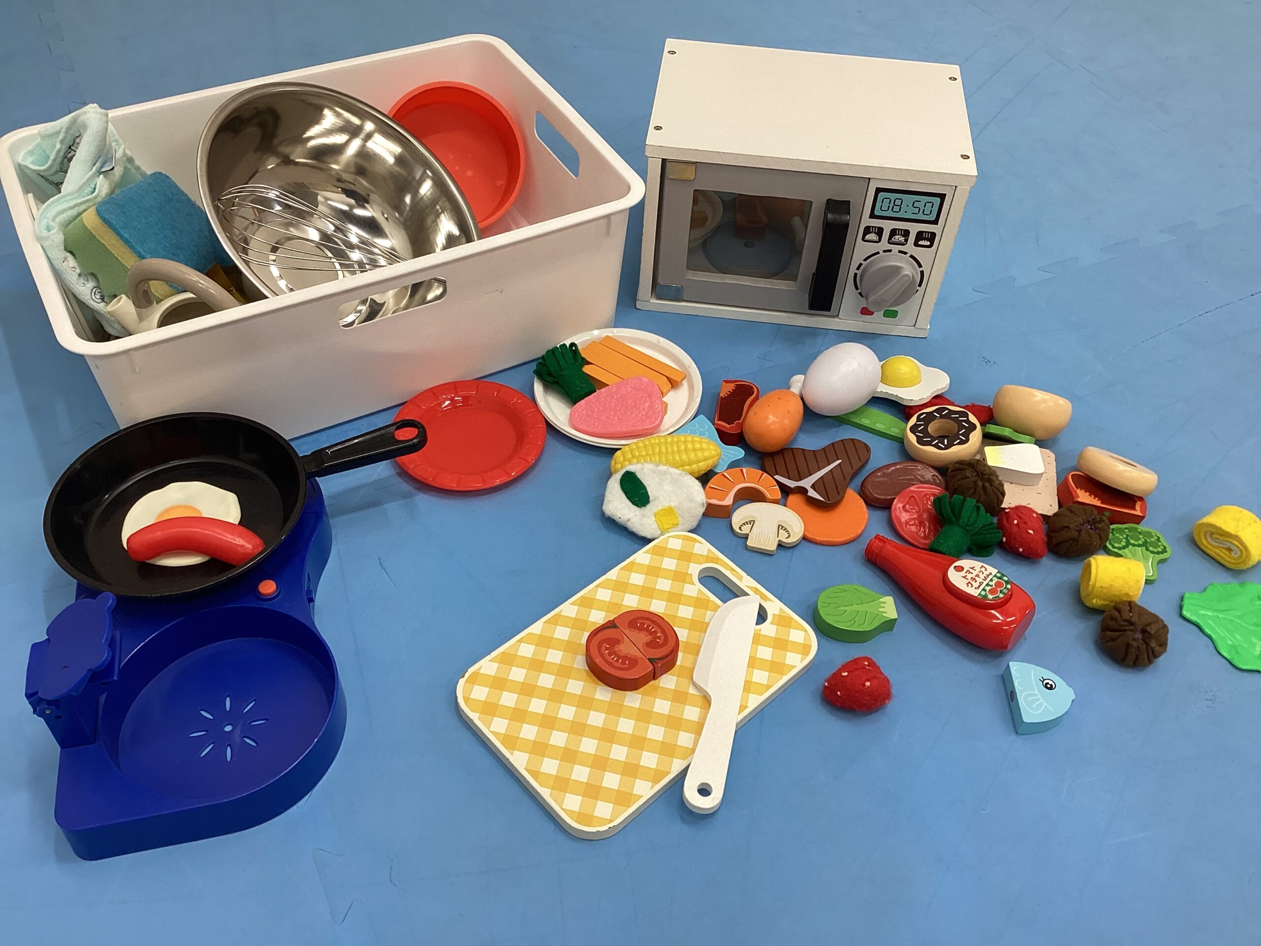 写真のような道具を使って、お客さんと店員さん、お医者さんと患者さん、それぞれの役になったり、おままごとで