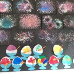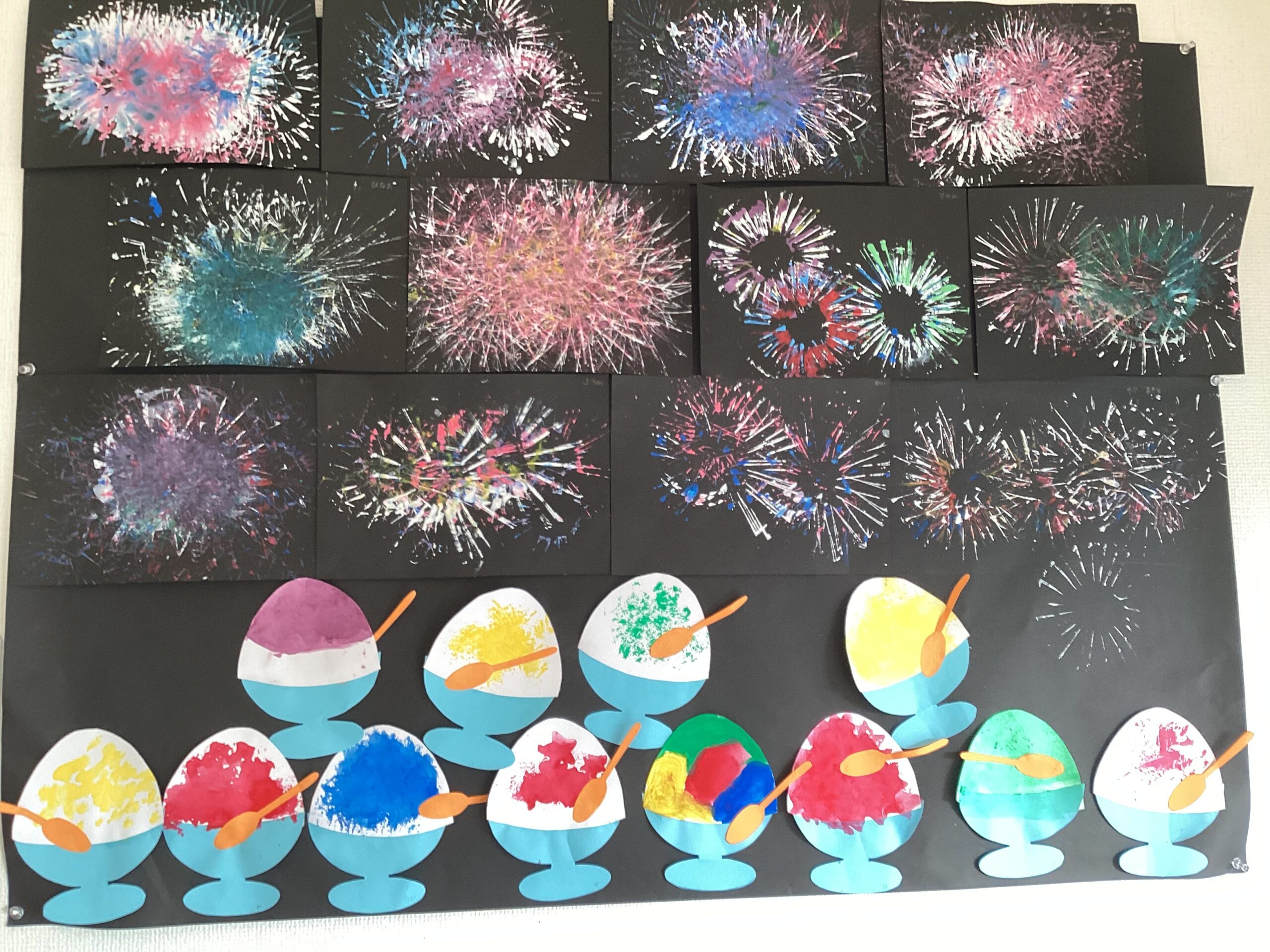 形や大きさの種類のあるスタンプを選び、自分の好きな色や好きな味を思い浮かべながらとても上手に作ってくれました。大好きな色でかき氷も花火も作るお友達がいれば、用意された全部の色を使い分け、さらにはまぜたりしながら色んな色を出すお友達もいて、とてもステキな作品が出来ました!